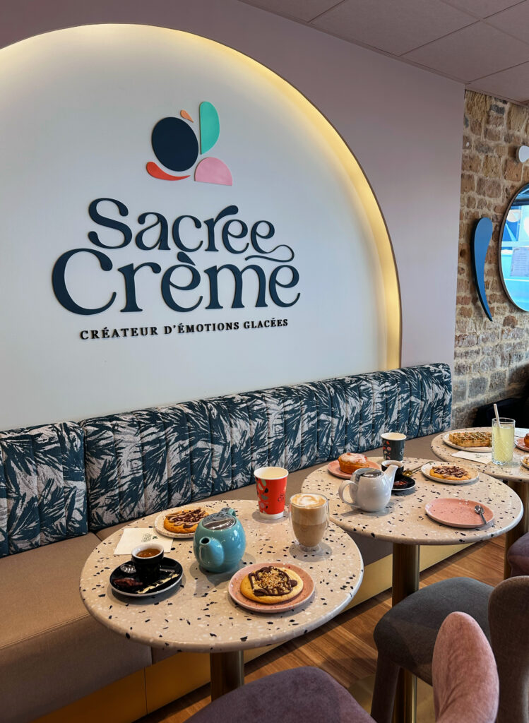 Sacrée Crème propose un concept hybride unique qui allie les plaisirs d’un glacier artisanal à l’ambiance chaleureuse d’un coffee shop, répondant aux attentes des consommateurs modernes